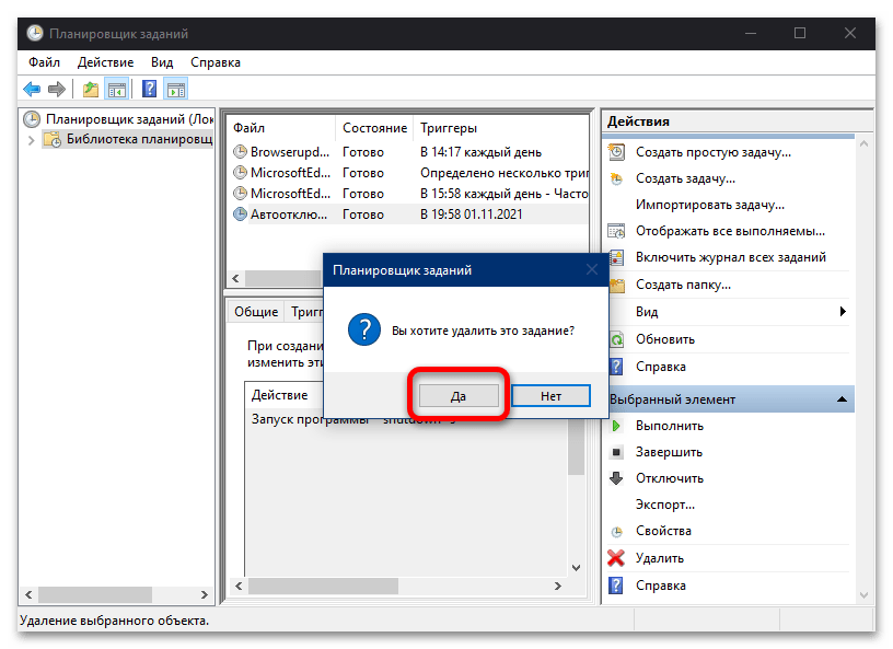 Далее подтвердите желание удалить задачу, после чего закройте «Планировщик заданий».