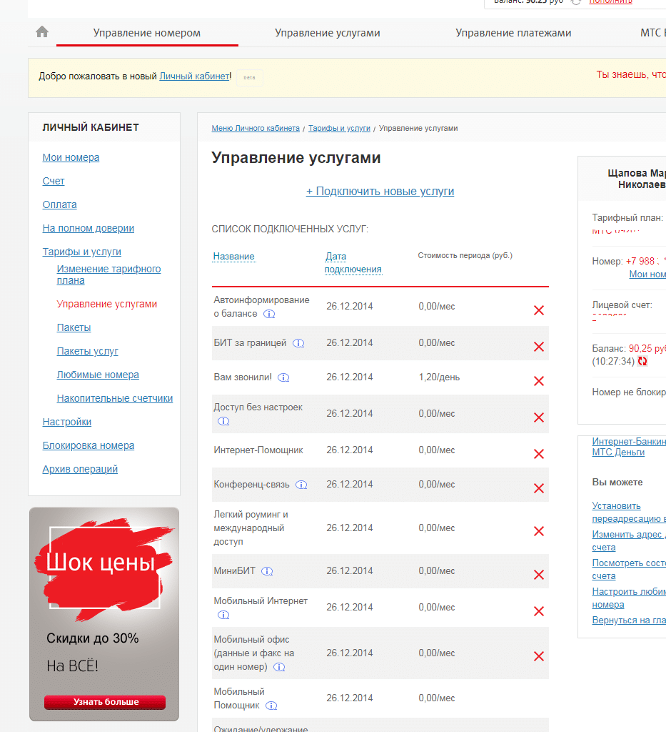 Получить быструю информацию о подключенных услугах и отключить их можно с помощью Центра управления услугами Билайн: