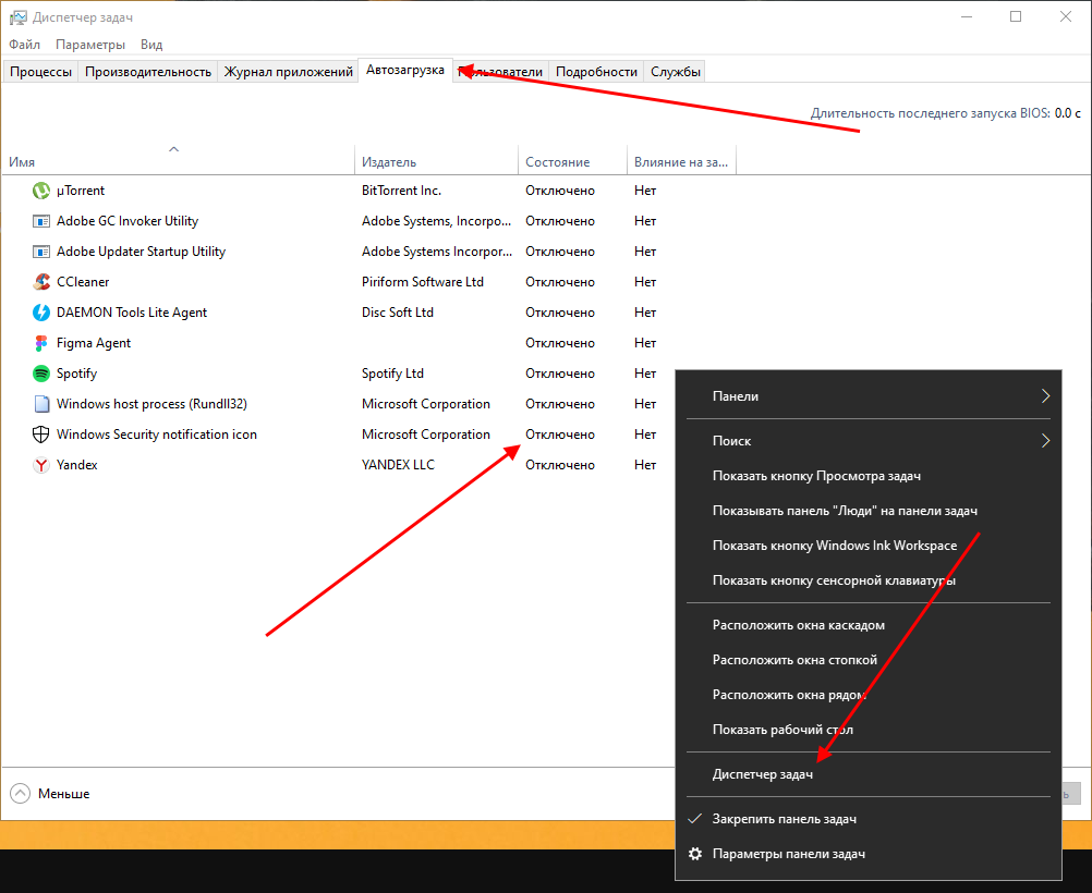 Также обратите внимание на то, что после деактивации программы ее иконка все равно будет отображаться в области уведомлений на панели задач. Чтобы ее отключить, необходимо перейти в «Диспетчер задач» через правый клик кнопки по панели задач и переключить параметр «Windows Security notification icon» в состояние «Отключено»