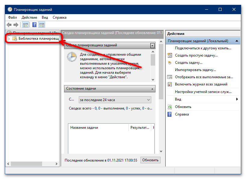 После запуска оснастки кликните левой кнопкой мыши по категории «Библиотека планировщика заданий» в боковом меню.