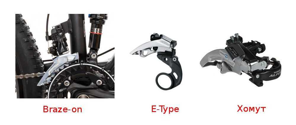 На данный момент существует три способа крепления переднего переключателя: при помощи хомута на трубу рамы, установка на специальную площадку («Braze-on») или на каретку велосипеда («E-type»). Последние два типа встречаются очень редко и являются стандартами.