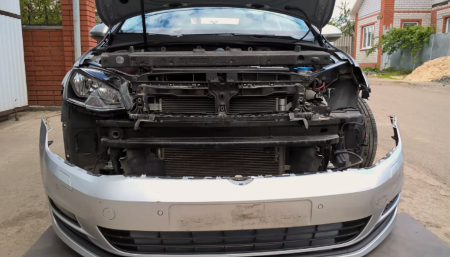 Отличительной особенностью при снятии переднего бампера является то, что для того, чтобы выполнить эту работу, нужно демонтировать решётку бампера Гольф 6.