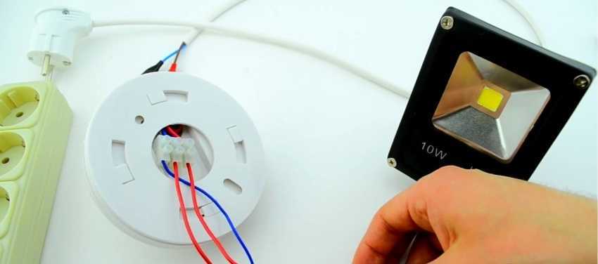 - Подключаем фотореле к прожектору или лампе, вот так это выглядит на фото.