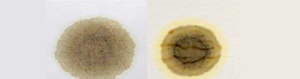 Анализ засохшей капли масла из двигателя Toyota Prius: ядро светлое (смазка залита недавно), цвет второго круга тоже относительно светлый (масло еще не состарилось), контур третьего круга равномерный, без зигзагов и колец желтого цвета (воды и антифриза нет).