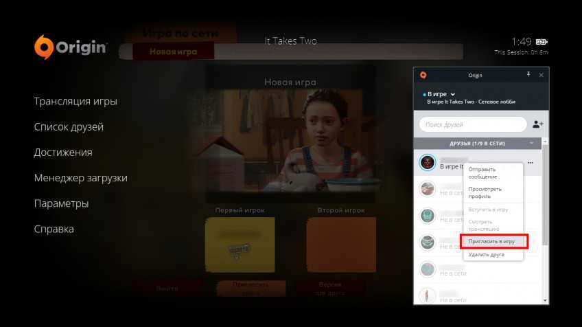 - Откроется оверлей Origin, где в списке друзей следует кликнуть правой кнопкой мыши по нужному и выбрать пункт «Пригласить в игру».