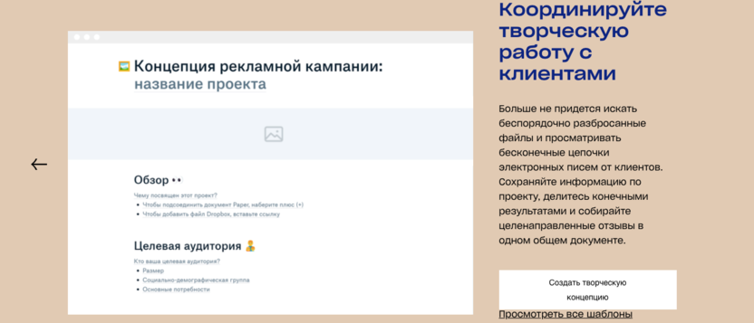Рабочее пространство в Dropbox Paper синхронизируется с одноименным облаком и доступно сразу на нескольких устройствах (через браузер и мобильные приложения).