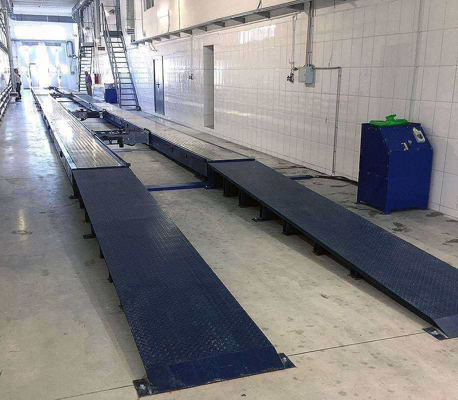 По требованию заказчика параллелограммные подъемники 12Г272М1, 24Г272М1, 36Г272М1, 48Г272М1, 60Г272М1 Челябинского завода автосервисного оборудования могут быть грузоподъемностью 12, 24, 36, 48 и 60 тонн и длиной от 5 до 24 метров. Монтаж может быть произведен одним из двух способов. Первый – если не готов пол. В этом случае установку лучше провести с помощью закладной установочной рамы, поставляемой заводом вместе с подъемником. Рама вывешивается по уровню на регулировочных болтах и вспомогательных швеллерах, заливается бетоном. Если же пол готов (армированный бетон М 150 и маркой выше, толщиной не менее 150 мм), то установка на него подъемника производится при помощи анкерных болтов. Вначале подъемник выставляется по уровню при помощи регулировочных пластин, при этом металлические связи между опорами останутся над бетоном. По месту сверлятся отверстия под анкерные болты. Затем подъемник крепится анкерами к полу.