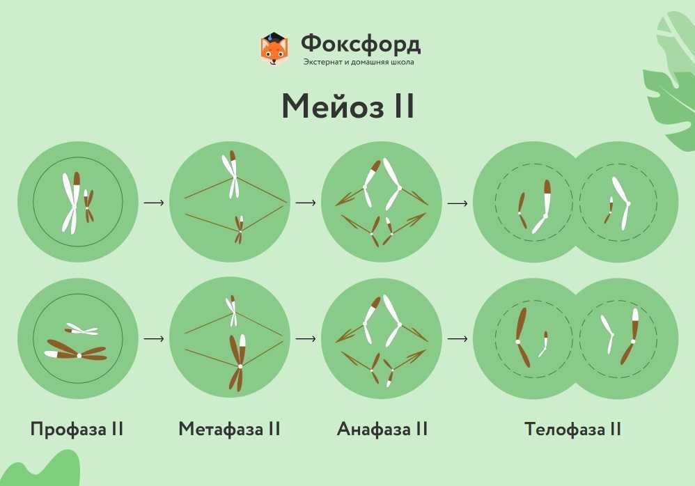 Во время мейоза одна клетка с 46 хромосомами делится дважды. Первое деление называется мейоз I, второе деление называется мейоз II. Интерфаза между двумя этапами деления мейоза настолько кратковременна, что практически незаметна, и в ней не происходит удвоение ДНК. В результате образуются четыре дочерние клетки, каждая с 23 хромосомами.