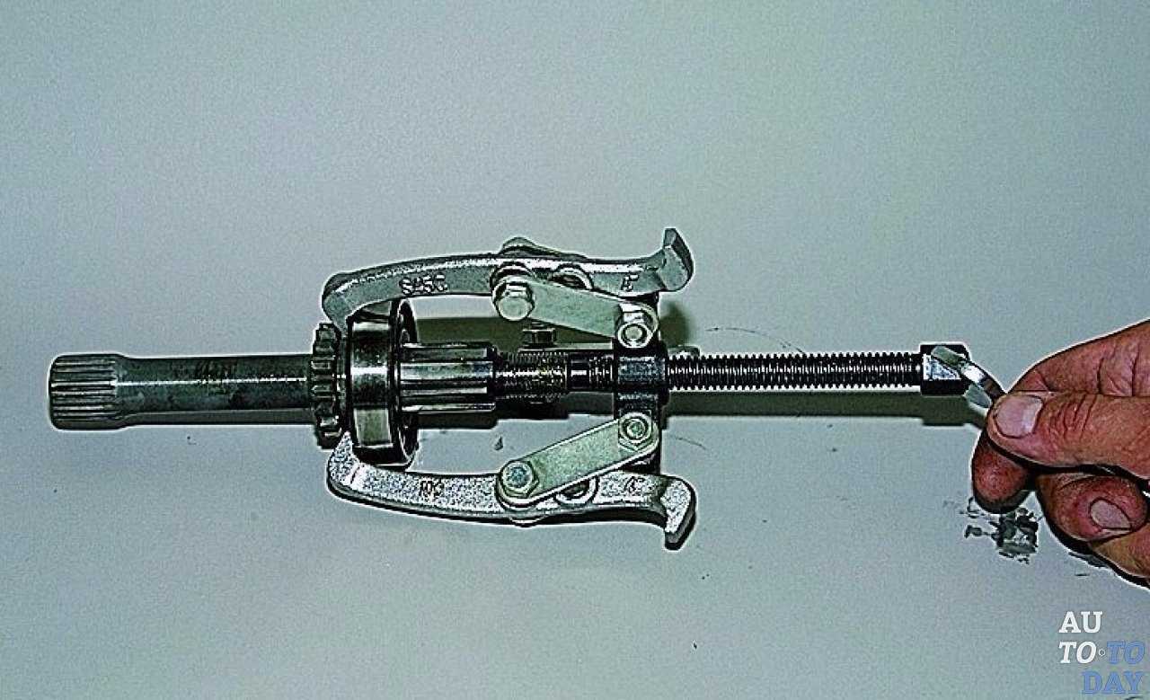 Зажмите в тисках ведущий вал и снимите упорное кольцо и задний подшипник, используя для этого специальный съемник. Следом за ними достаньте с ведущего вала шестерню низшей передачи (вместе с втулкой), муфту переключения передач, ее ступицу и шестерню высшей передачи.