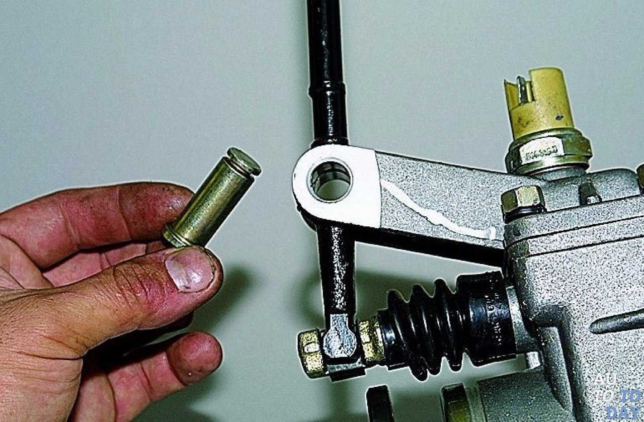 После этого снимаем крышку переднего подшипника ведущего вала и крышку смотрового люка, следом за которым демонтируется кронштейн рычага переключения передач (вместе с самим рычагом) и изымается штопорная шайба. Сняв шайбу, вы сможете вынуть ось и снять рычаг.