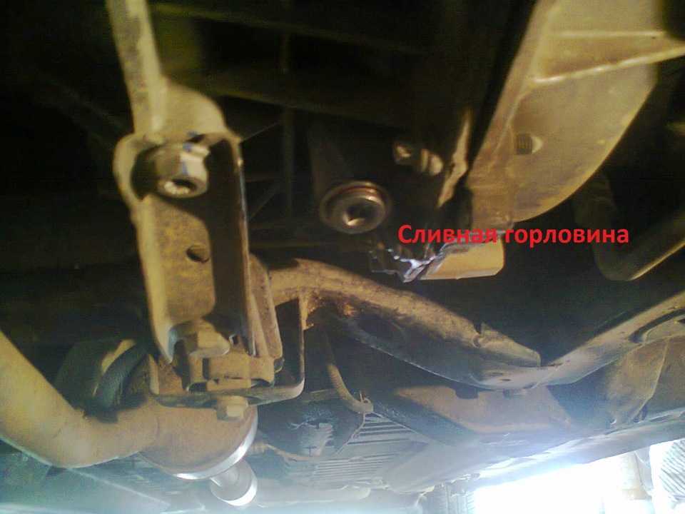 - Вручную снять пластиковую заливную пробку коробки передач, ключом на «8» открутить сливную пробку и слить масло в специально приготовленную ёмкость.