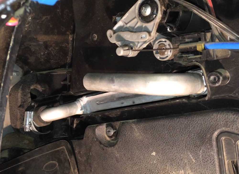 Теперь при помощи отвёртки открутите саморезы, которые фиксируют уплотнитель, прижимая его к перегородке. После снятия саморезов слегка подковырните уплотнитель и снимите его полностью. Следующие действия вам будет удобнее провести с салона авто, они заключаются в том, что вам нужно ослабить прижимной винт крана, воспользовавшись рожковым ключом.