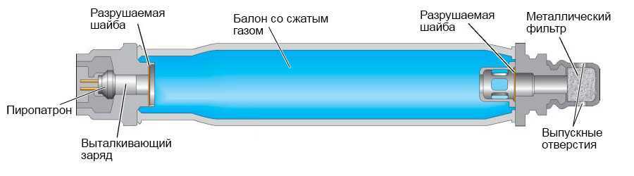 Основным составным элементом этой системы является исполнительный механизм – газогенератор. В его задачу входит генерация большого количества газа в короткие сроки, которым затем заполняется сама подушка.