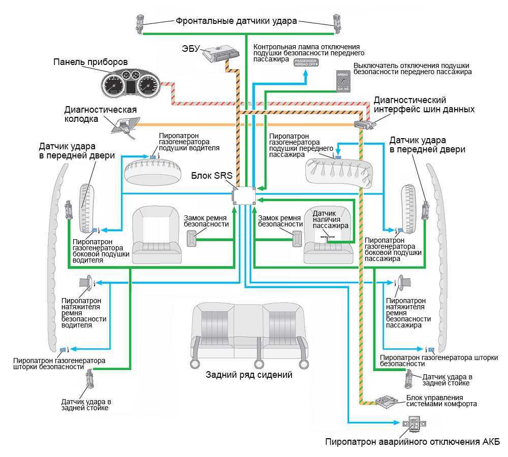 Важно понимать, что сама по себе подушка безопасности — только часть целой системы, которая отвечает за жизнь и здоровье людей в машине в момент столкновения или наезда на препятствие. Вообще же в систему развернутой безопасности SRS входят: