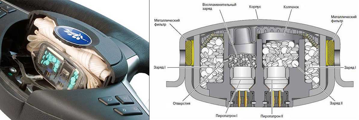 Нередко на современных авто устройство подушки безопасности включает в себя двухкамерный газогенератор, в котором два пиропатрона и две камеры сгорания. Особенность такого генератора заключается в последовательном задействовании пиропатронов.