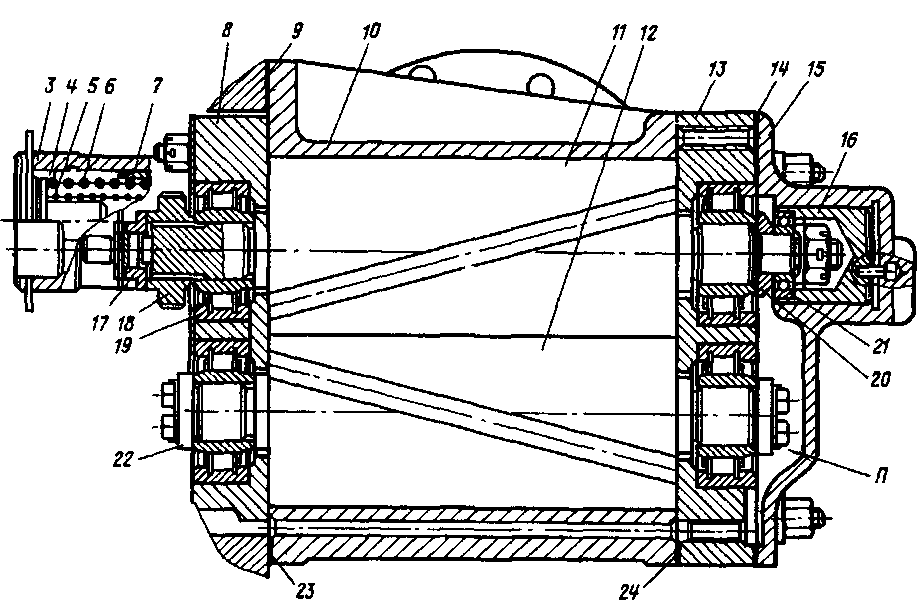 1,2-пробки; 3-корпус клапана; 4-нажимная гайка; 5, 6-пружины; 7-редукционный клапан; 8- анутренняя планка подшипников; 9, 14, 23, 24-прокладки; 10-корпус; 11-ведущая шестерня, 12-ведомая шестерня; 13-наружная планка подшипников, 15-крышка: 16-поршень; 17- гайка; 18 — зубчатый поводок; 19 — роликоподшипник; 20,22 — шайбы; 21 — подшипник; Н,П — полости нагнетения и подачи