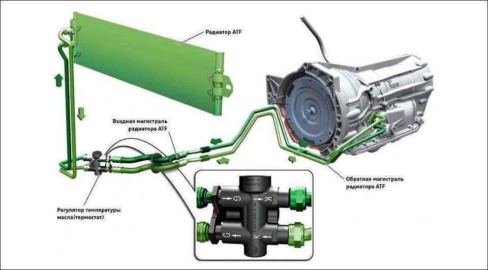 Заводится мотор и начинается накачивание давления в коробке и циркуляция трансмиссионной жидкости. При таком способе отработка вытесняется из гидротрансформатора и гидроблока естественным путем. Когда сольется около 4 л, двигатель глушат и доливают еще свежей АТФ. Мотор снова запускается и продолжается прокачивание системы. Заметив светлый цвет смазки на выходе, процесс останавливается. Остается присоединить шланги к патрубкам радиатора, выставить уровень и проехать на автомобиле в разных режимах для теста.