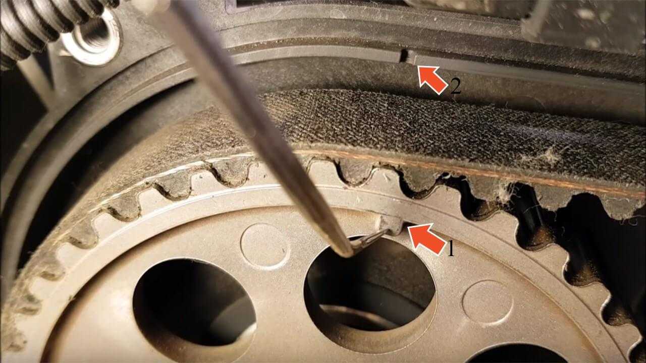 Для проверки корректности регулировки необходимо 2 раза прокрутить вал мотора и установить поршень 1 цилиндра в верхней крайней точке. При этом метки на шестернях должны совпасть с насечками на картере двигателя. Если отмечается смещение отметок на шкиве коленчатого вала, то ремень снимается и производится корректировка положения.