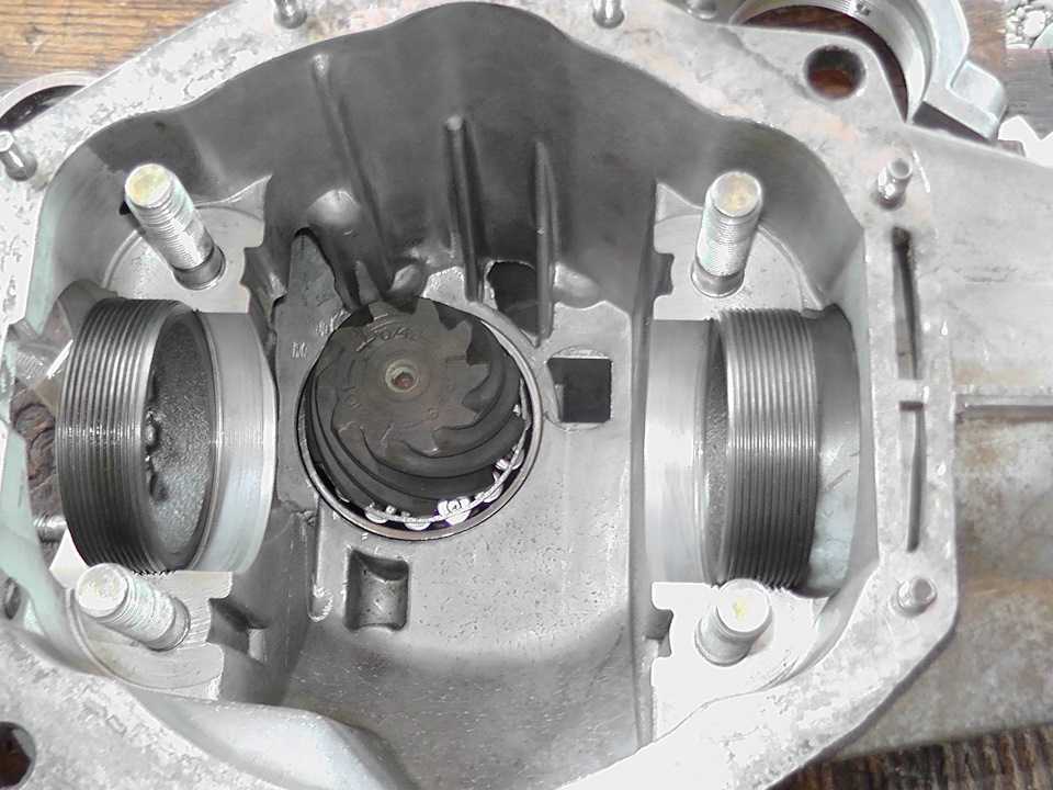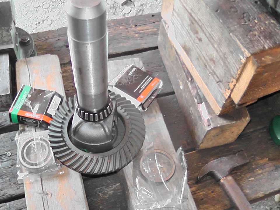 Подобрали регулировочное кольцо нужной толщины, запрессовали подшипник на ведущую шестерню, надели распорную втулку-все в картер, передний подшипник на хвостовик, маслоотражетельную шайбу, запрессовываем сальник
