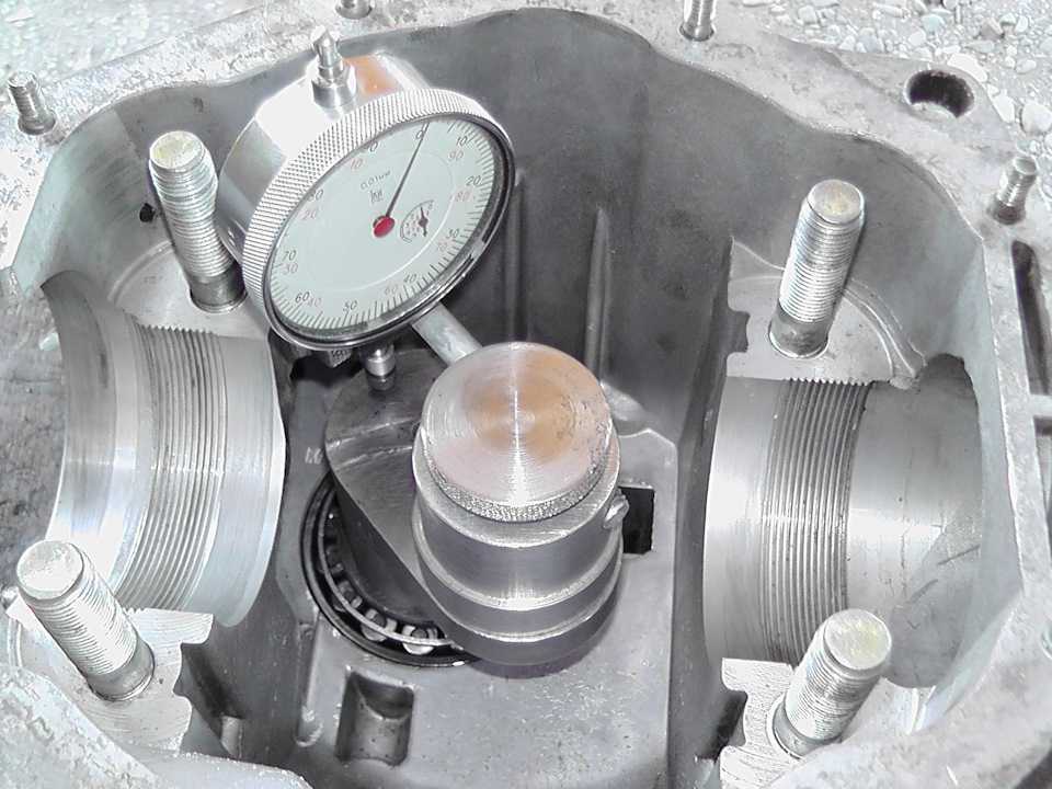 …Итак, собираем предний редуктор.Запрессовали наружные кольца подшипников в картер-теперь замеряем базу картера.Ставим подшипники ВПЗ с металлическими сепараторами.
