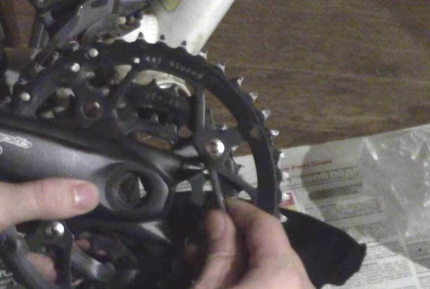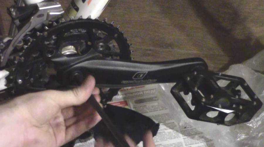 - Установить нужную звездочку на паук и затянуть крепления. Большую деталь поменять вместе с правым шатуном и прикрутить на него среднюю и малую звезды.