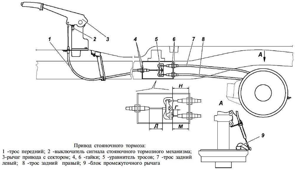 Привод стояночной тормозной системы механического типа: 1 – кнопка фиксации рычага; 2 – рычаг привода стояночного тормоза; 3 – защитный чехол; 4 – тяга; 5 – уравнитель троса; 6 – регулировочная гайка; 7 – контргайка; 8 – трос; 9 – оболочка троса