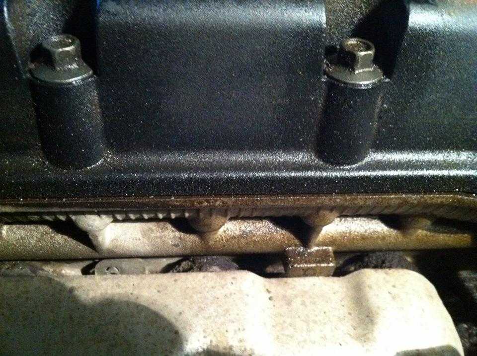 В закрытом пространстве под крышкой клапанов давление масла отсутствует, поскольку там находится воздух. Но в процессе работы мотора быстро крутящийся распредвал, чьи подшипники обильно смазываются, разбрасывает множество мелких капель во все стороны. Попадая на внутренние стенки, масло стекает обратно в картер. При возникновении малейшего зазора между уплотнительным материалом и прилегающими поверхностями смазка неизбежно вытечет наружу.