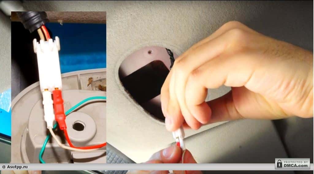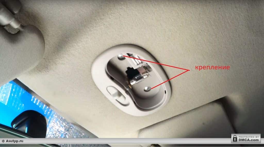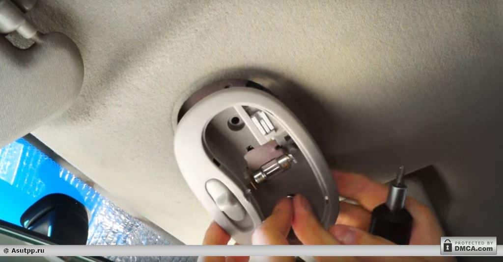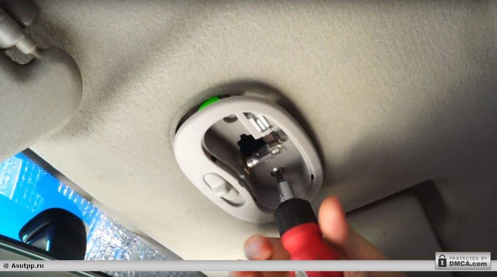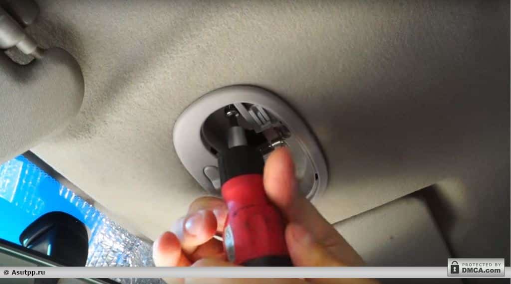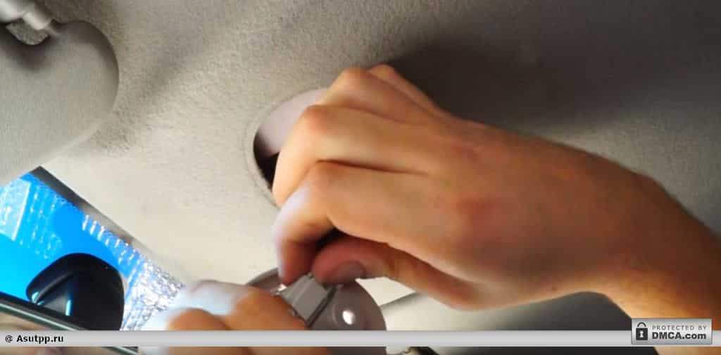 Далее необходимо снять плафон освещения салона автомобиля своими руками. Обычно он закреплен к обшивке несколькими винтами (от 2 до 4) либо механической защелкой. Тут нужно быть предельно осторожным, ведь к корпусу подведена электропроводка от АКБ. Все что Вам нужно – разъединить контакты.