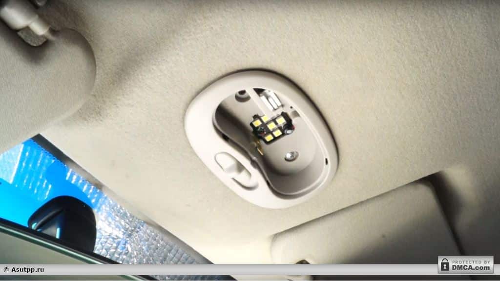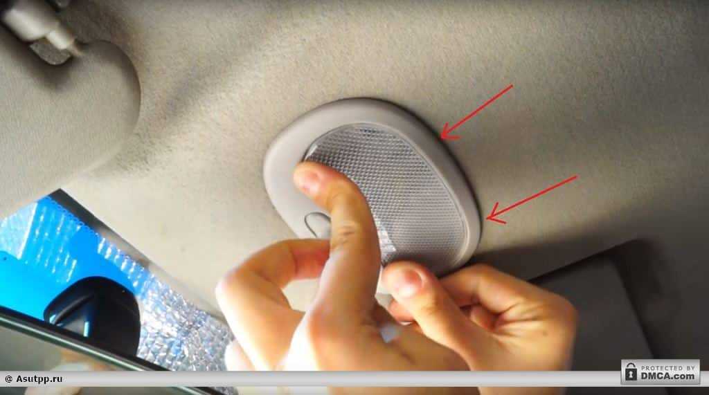 Плафон поддевается отверткой со стороны, противоположенной лобовому стеклу, и плавно тянется рукой на себя. В результате имеете осветительный прибор, висящий на проводах. Защитная панель снимается подцеплением пальцами с двух сторон. Основная лампочка видна сразу, боковые расположены по сторонам, в патронах, которые выкручиваются поворотом на 45 градусов против стрелки часов. Вся процедура смены и вытаскивания с последующим водворением на место занимает от силы – несколько минут.