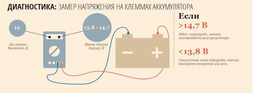 Напряжение должно быть не менее 14 вольт. Если напряжение меньше, то регулятор следует заменить. Регулятор можно поменять, не снимая генератор.