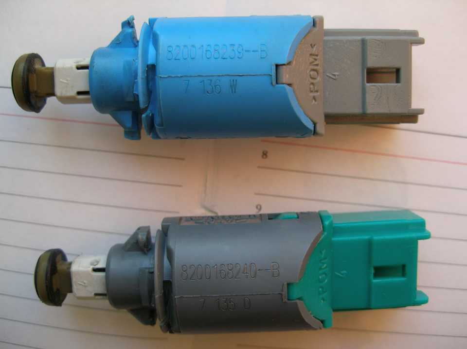 Выключатель сигнала торможения на автомобиле Рено Меган 2 установлен под панелью приборов на кронштейне педали тормоза. Он служит для включения сигналов торможения при нажатии педали тормоза. Также сигнал о нажатой педали тормоза используется системой управления двигателем.