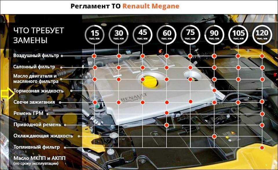 Уровень в бачке тормоза/сцепления Renault Megan будет постоянно снижаться, поэтому водителю надо следить за ним. Чем сильнее изнашиваются башмаки, тем больше и быстрее масло начнет уходить. Рекомендуется менять жидкость через 1,5–2 года эксплуатации транспортного средства.