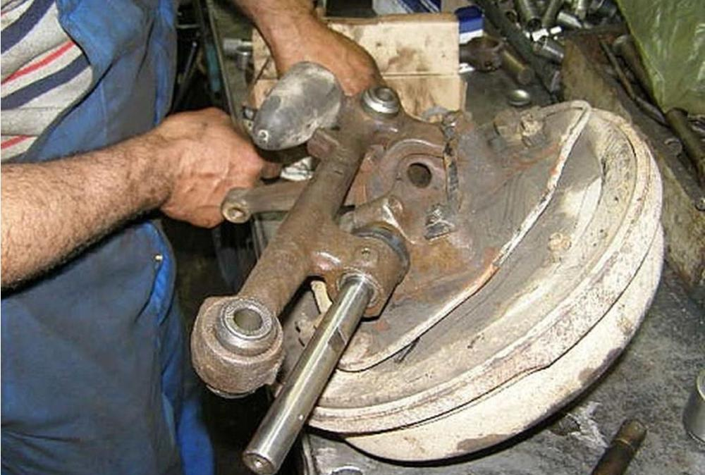 при помощи механического съемника, поворотный кулак при этом не снимается; В первом случае не требуется снимать регулировочный болт, который регулирует развал-схождение. Это сложный способ, если не съемника и смотровой ямы. Потому что ступицу выбить и обратно запрессовать, требуется много усилий.