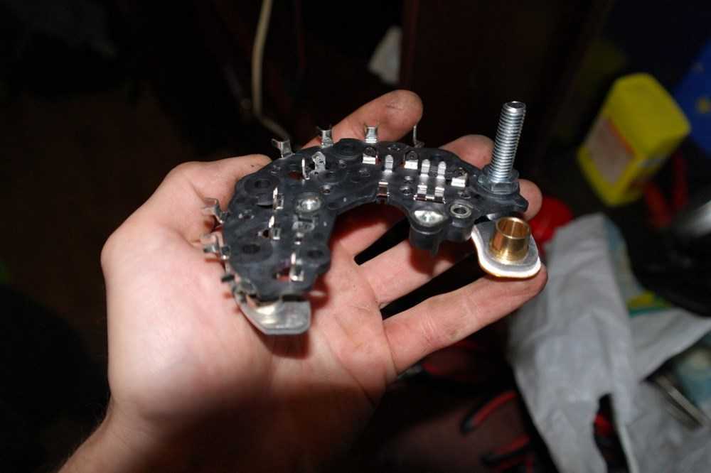 Диодный мост. Чтобы поменять диодный мост, сначала придётся снять регулятор напряжения. Выпрямитель в виде подковы припаивают к выводам стартера. Всего предусмотрено 6 точек пайки. Отделите выводы обмотки с помощью бокорезов. Затем открутите 4 гайки под ключ на 8 и снимите элемент. Установка нового диодного моста осуществляется с помощью термопасты. Она обеспечит нужное качество контакта между выпрямителем и корпусом. Когда закрутите все гайки, не забудьте припаять к стартеру все 6 контактов нового диодного моста.