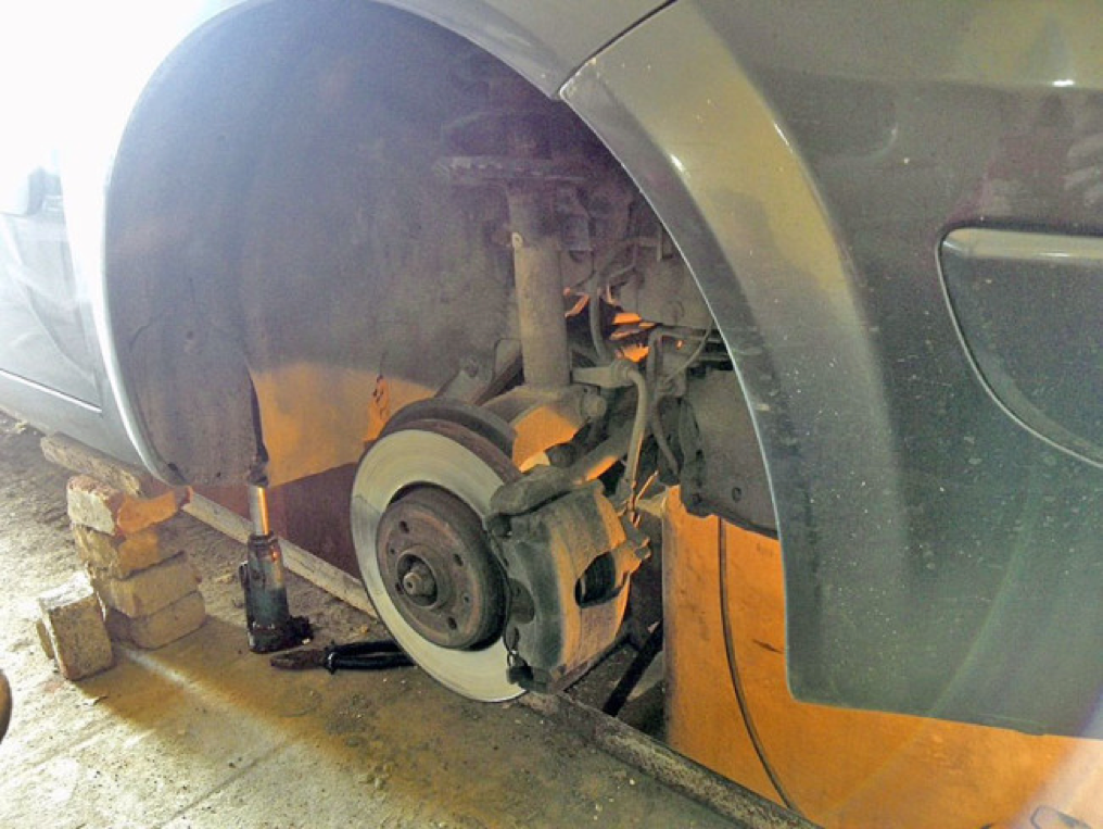 Автомобиль необходимо приподнять. Для этого может быть использовано специальное оборудование, но если его нет в наличии, то можно применить домкраты, при помощи которых автомобиль устанавливается на подставки.