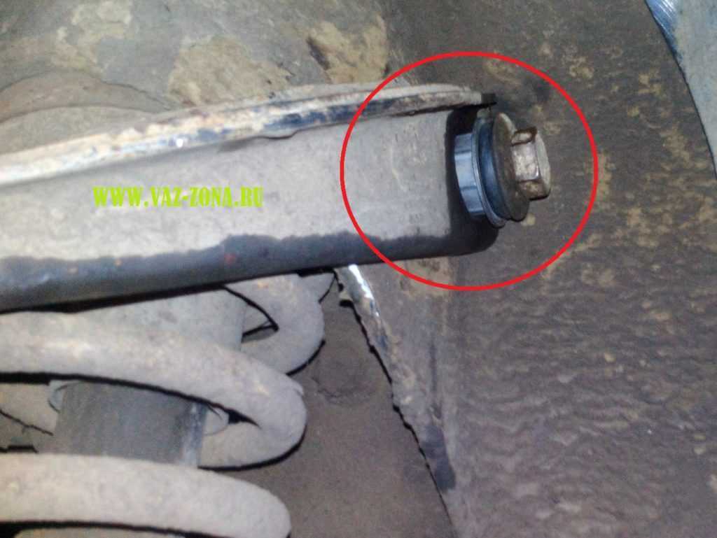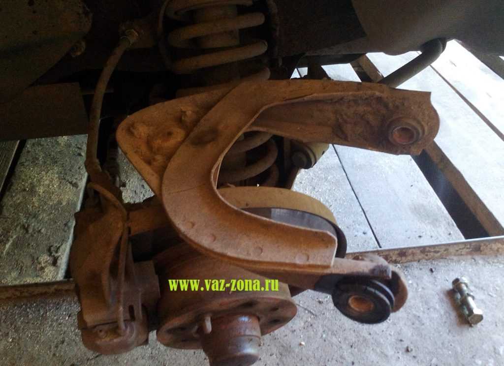 Ослабляем гайку крепления верхнего рычага ключом на 22 и пробуем прокрутить болт. Если он крутиться, а втулки стоят на месте, то Вам повезло! А вот если этот болт прокручивается с большим усилием и втулки крутятся с ними, то как говориться: — Хьюстон, у нас проблемы! Далее рассмотрим оба случая.