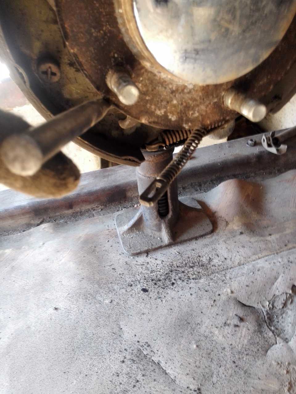 По замене все стандартно, вывешиваем мост, скидываем колеса, скидываем барабаны, а вот тут косяк. Старый хозяин оставил подарок, там где должно быть отверстие с резьбой для снятия барабана, торчит обломок болта, а одним болтом стянуть не получалось, пока не погрел газовой горелкой. При дальнейшем осмотре барабана нахожу второй косяк.