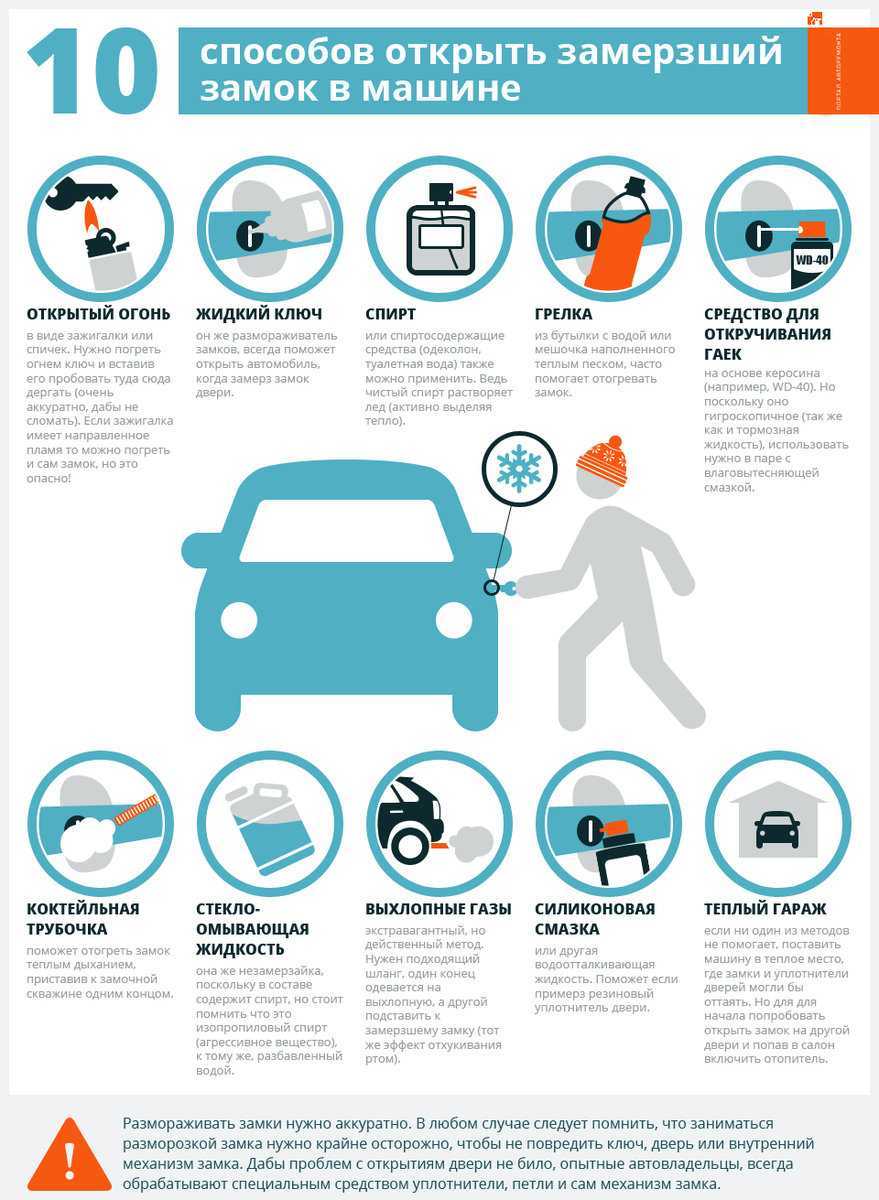 Обнаружив заледеневший замок автомобиля, не торопитесь принимать кардинальные меры. Первое, что необходимо сделать – попробовать открыть ключом дверцу со стороны пассажира. В случае успеха разблокировать остальные двери изнутри не составит труда.