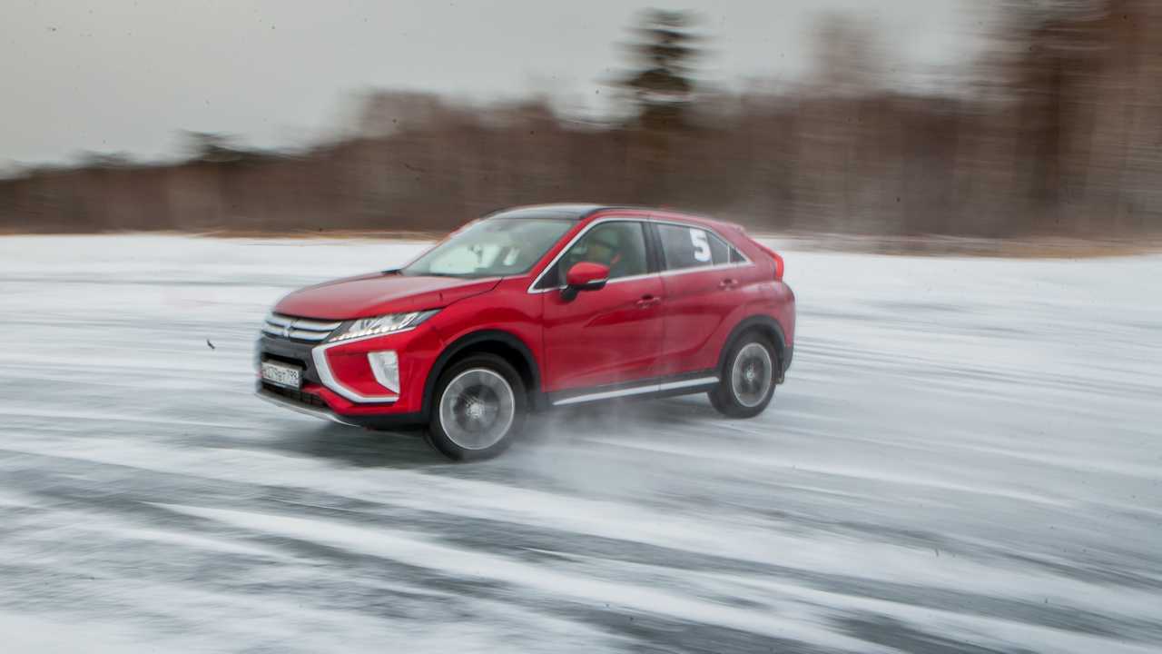 Кроссоверы Mitsubishi на ледовой трассе — отличная возможность проверить возможности фирменного полного привода S-AWC в экстремальных условиях.