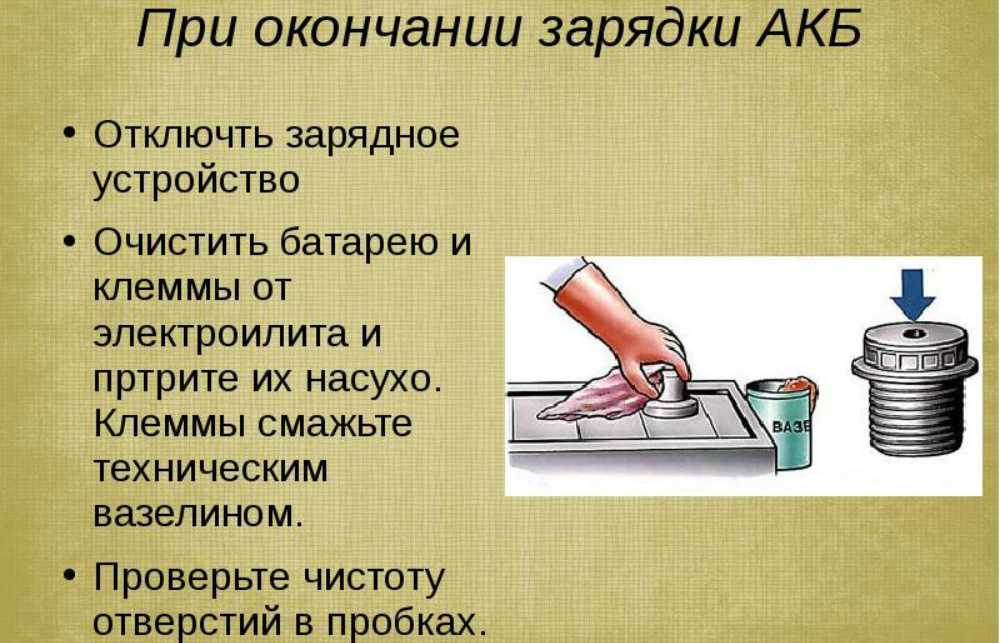 перед зарядкой из АКБ необходимо выпустить скопившиеся газы, почистив газоотводы или выкрутив пробки из банок;